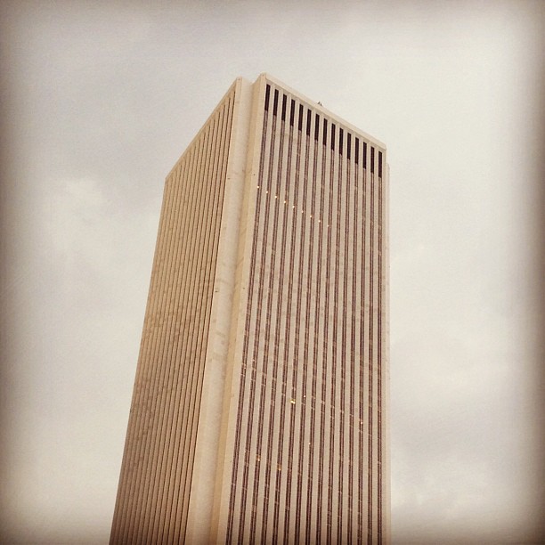 Two tall cylindrical towers with distinctive curved, corn-cob-like architectural details rise against a purple and pink gradient sky, photographed from a low angle looking upward.