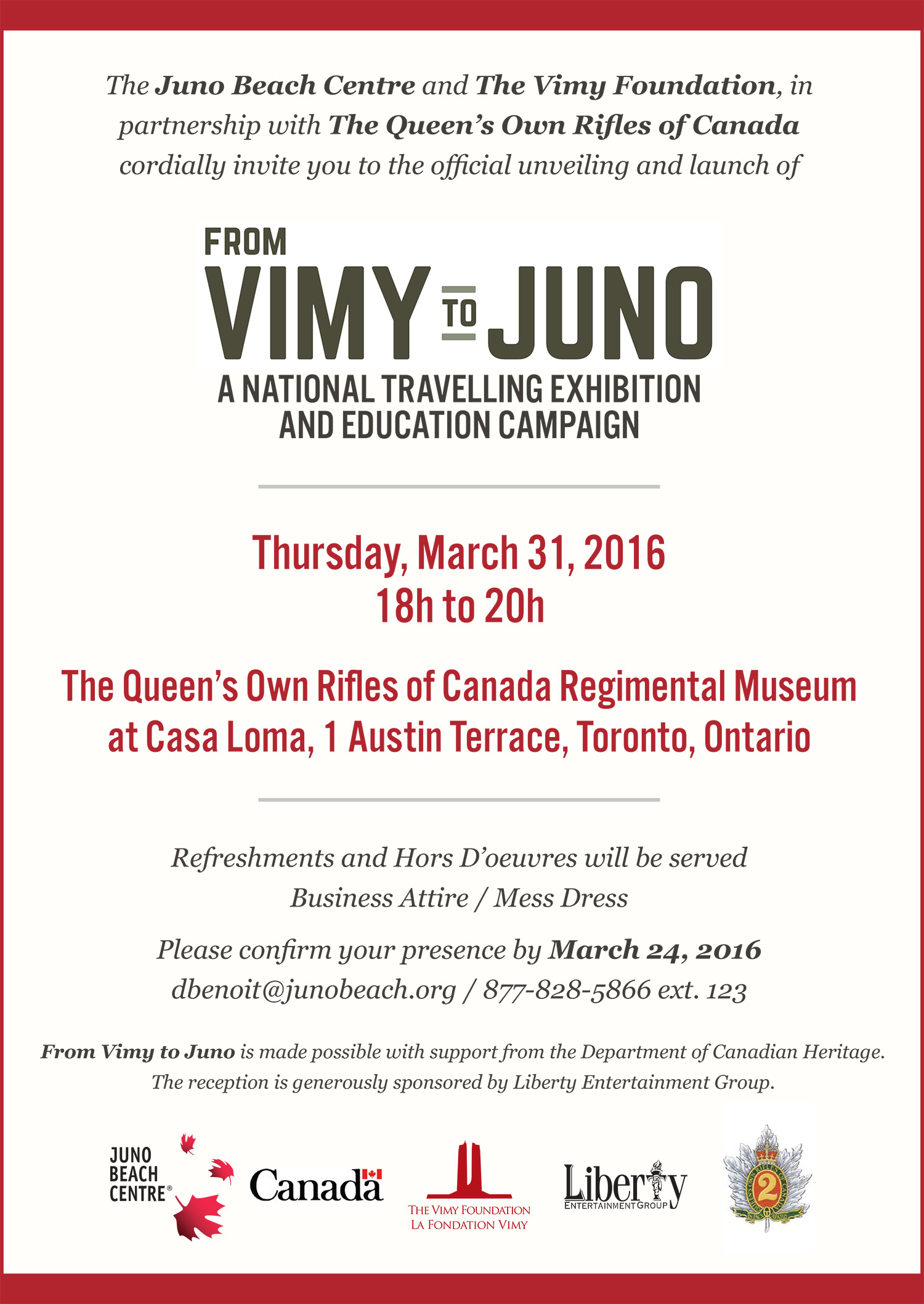 Formal invitation for the "From Vimy to Juno" traveling exhibition launch event on March 31, 2016 at The Queen's Own Rifles of Canada Regimental Museum in Toronto, featuring red and beige color scheme with organizational logos at the bottom.